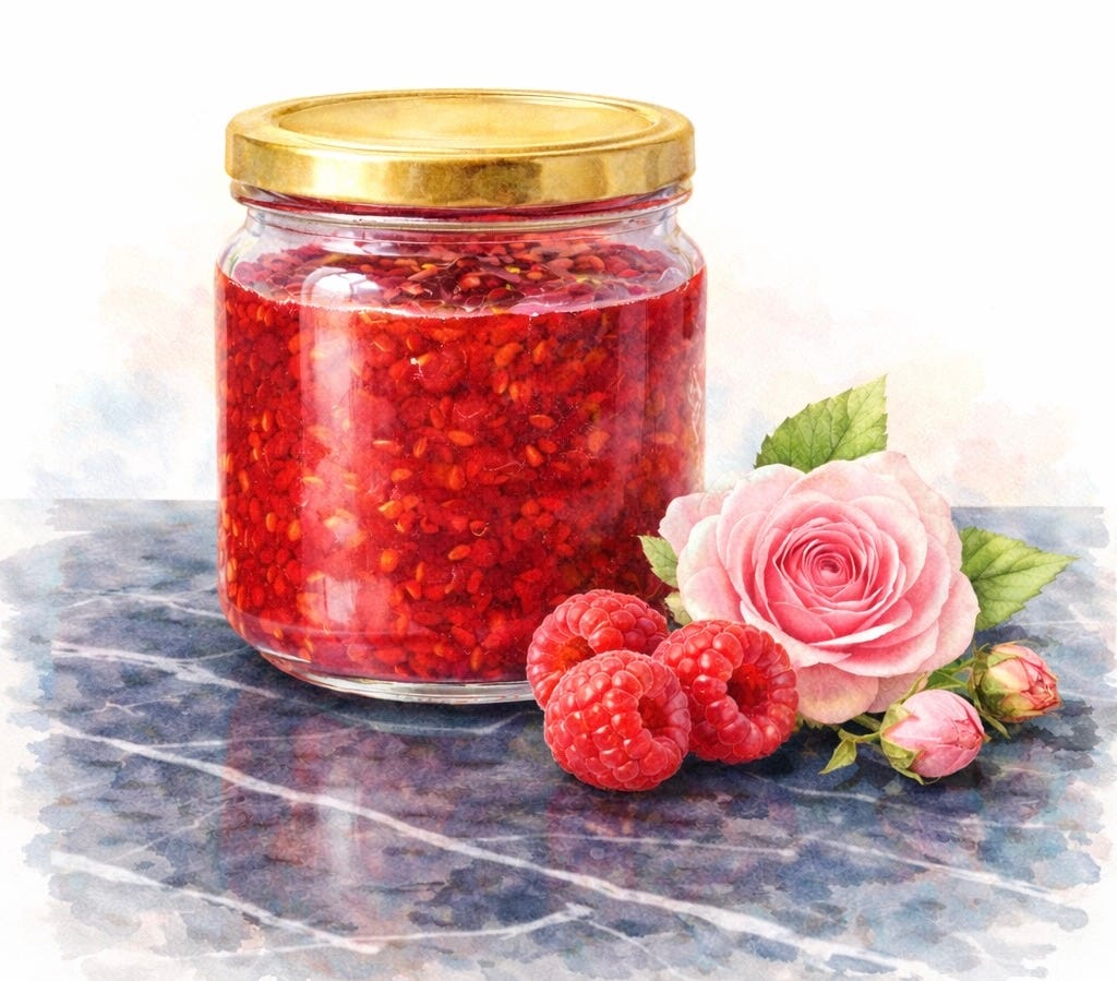 I wanted this flavor to feel private, almost ghostly. It takes the sharp, bright edge of a raspberry and pulls it into the shade, making it something softer. It’s not an everyday condiment; it’s a secret you keep in a jar. It’s fragrant, a little bruised, and meant for the people who know that the best things usually have a bit of a bite to them.